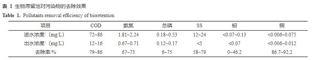 3. 不同雨水工程的污染物去除效果 3.1 生物滯留池 生物滯留池進(jìn)出水水質(zhì)與污染物去除率見(jiàn)表1。從表1可以看出,生物滯留池進(jìn)水水質(zhì)相當(dāng)于GB 3838—2002《地表水環(huán)境質(zhì)量標(biāo)準(zhǔn)》劣Ⅴ類(lèi),特別是COD較高,為72~86 mg/L,進(jìn)水水質(zhì)差主要是由工程匯水范圍內(nèi)車(chē)流量較大引起的。
