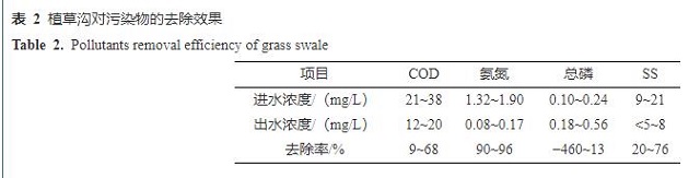植草溝的進(jìn)出水水質(zhì)與污染物去除率見(jiàn)表2。從表2可以看出,進(jìn)水徑流中COD、氨氮濃度分別為21~38和1.32~1.90 mg/L。進(jìn)水污染物濃度相對(duì)較低,推測(cè)原因是匯水范圍內(nèi)道路車(chē)輛較少,且前期晴天日較短。對(duì)比COD、氨氮、總磷和SS 4種污染物,植草溝對(duì)氨氮的去除效果最好,平均去除率達(dá)到91.3%,平均出水濃度為0.12 mg/L。但是文獻(xiàn)報(bào)道的植草溝對(duì)氨氮的去除率相差較大,如楊銀川等[11]發(fā)現(xiàn)植草溝對(duì)氨氮的去除率達(dá)93%,而章茹等[18]研究表明,植草溝對(duì)氨氮的去除率僅為19%。與氨氮相似,SS和COD的去除效果在不同研究中也相差較大。本研究植草溝對(duì)SS和COD的平均去除率分別為51.9%和40.3%。荊武等[19]研究表明,植草溝對(duì)COD的去除率僅為4.3%,而付恒陽(yáng)等[20]研究結(jié)果為76.5%。不同研究中植草溝的污染物去除效果差別較大,主要是因?yàn)橹膊轀辖Y(jié)構(gòu)相對(duì)簡(jiǎn)單,抗沖擊能力較弱,降水強(qiáng)度、植物種類(lèi)、進(jìn)出水方式等都會(huì)對(duì)其污染物去除效果產(chǎn)生影響。如下滲徑流與溢流徑流對(duì)污染物去除存在影響,研究表明下滲徑流相對(duì)于表面溢流徑流在污染物去除方面更有優(yōu)勢(shì),主要是因?yàn)橹参锔岛屯寥缹?duì)下滲徑流的過(guò)濾截留作用更明顯[21]。另有研究表明,降水強(qiáng)度越大,徑流污染的控制效果越差。如李海燕等[22]實(shí)地監(jiān)測(cè)并分析了植草溝在暴雨事件中的凈化效果,結(jié)果表明,SS、氨氮、COD的平均去除率僅有10%~35%。