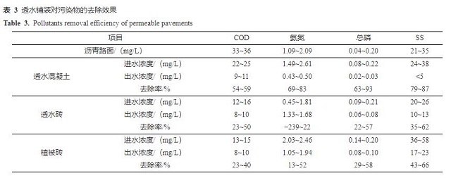 本研究中透水鋪裝建成2年,使用年限較短,對(duì)污染物的去除效果明顯。有研究證明,隨著使用年限的增長(zhǎng),透水鋪裝去除污染物的效果會(huì)逐步下降[25],但是通過(guò)清洗,可使透水鋪裝材料中污染物(特別是COD和氨氮)溶出,使其對(duì)污染物的去除效果有所恢復(fù)。因此,透水鋪裝工程應(yīng)及時(shí)清洗維護(hù),以保持其污染物去除效能[26]。