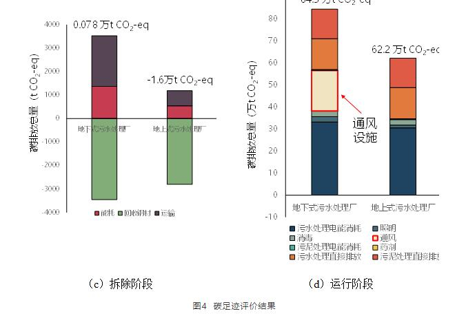 案例污水處理廠全生命周期碳足跡評價結果如圖4所示。地下廠全生命周期總碳排放量約87.1 萬t CO2-eq,較地上廠高36.5%,其中,運行階段碳排放量可達總量的95%以上。由于地下工程結構,地下廠在建設(圖6b)與拆除階段(圖6c)中,需要額外的施工量與建材消耗;在運行階段(圖6c),則需額外通風、照明等電力消耗。因此,地下廠運行階段(20年)總碳排放量較地上式高35.8%;其中,地下廠額外通風產生的碳排放量約18.4萬t CO2-eq,占總排放量的22%。可見,地下式污水處理廠全生命周期中會產生大量碳排放,不符合碳減排、碳中和的社會發展方向。