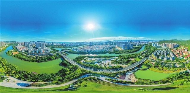 從空中俯瞰三亞,一幅“山水人城”美景現于眼前:河流穿城而過,水在城中,青山環繞……河中的魚群、棲息的白鷺、岸堤的游人,繪就和諧相融新畫卷。