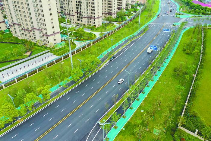 鷹東大道海綿化改造項(xiàng)目在城市道路主脈絡(luò)上落實(shí)了海綿城市理念,奏響了和諧共生新樂章。該項(xiàng)目位于信江新區(qū)北部,北起龍虎山大道,南至鷹東大橋北側(cè)橋頭,道路全長(zhǎng)約4.3公里,新建道路斷面24米至55米,定位為城市主干道。通過開口路緣石將車行道內(nèi)雨水引入側(cè)分帶內(nèi)下沉式綠地;在人行道下設(shè)置過水通道,將非機(jī)動(dòng)車道雨水引入防護(hù)綠地,防護(hù)綠地同時(shí)還收集相鄰地塊內(nèi)徑流,經(jīng)下沉式綠地凈化、滯蓄后排入雨水管道,實(shí)現(xiàn)了道路海綿設(shè)施與周邊地塊的結(jié)合與聯(lián)動(dòng),增強(qiáng)了海綿城市建設(shè)的系統(tǒng)性;人行道采用透水鋪裝,滲排管收集滲水排入雨水管道,實(shí)現(xiàn)了對(duì)道路全斷面徑流的管控。建成后年徑流總量控制率為82.8%,透水鋪裝面積為3.2585萬平方米,透水鋪裝率14.6%,SS(固體懸浮物)去除率為74.52%。此外,由于鷹東大道雨水管道雨水排入相鄰石鼓渡河,故而在雨水排口處做消能及生態(tài)化處理措施,進(jìn)一步消除面源污染,保障入河水質(zhì)。