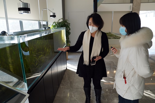 牛奕娜在魚(yú)缸前為記者介紹魚(yú)的情況。