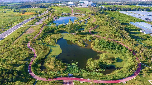 “我們通過(guò)利用植物與水系形成山水環(huán)境,把生態(tài)功能濕地、文化景觀元素、田園郊野風(fēng)貌、濕地水系景觀進(jìn)行有機(jī)融合,在大尺度上形成由北向南山林環(huán)繞,水系流動(dòng)的空間格局。”牛奕娜介紹,“通過(guò)水生植物的吸收、濕地填料的吸附、微生物的分解等方式能夠削減面源污染,穩(wěn)定河道水質(zhì)和保護(hù)河道水生態(tài)系統(tǒng)的健康。”