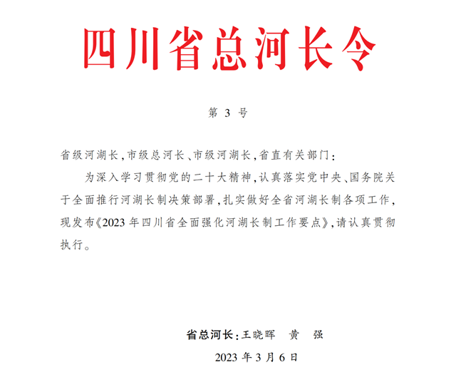 為深入貫徹落實黨中央、國務院和省委、省政府關于全面推行河湖長制的決策部署,根據《四川省全面落實河長制工作方案》(川委辦發電〔2017〕12號)《關于全面落實湖長制的實施意見》(川委辦〔2018〕33號)工作安排,持續強化全省河湖長制,統籌上下游、千支流、左右岸協同共治,推動江河湖庫生態保護治理和休養生息,維護河湖健康生命。現結合我省實際,制定2023年度工作要點。