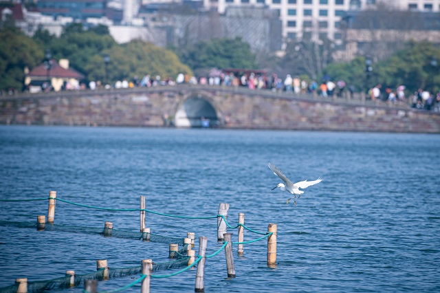 3月15日,水鳥在杭州西湖斷橋附近的湖面上飛翔。