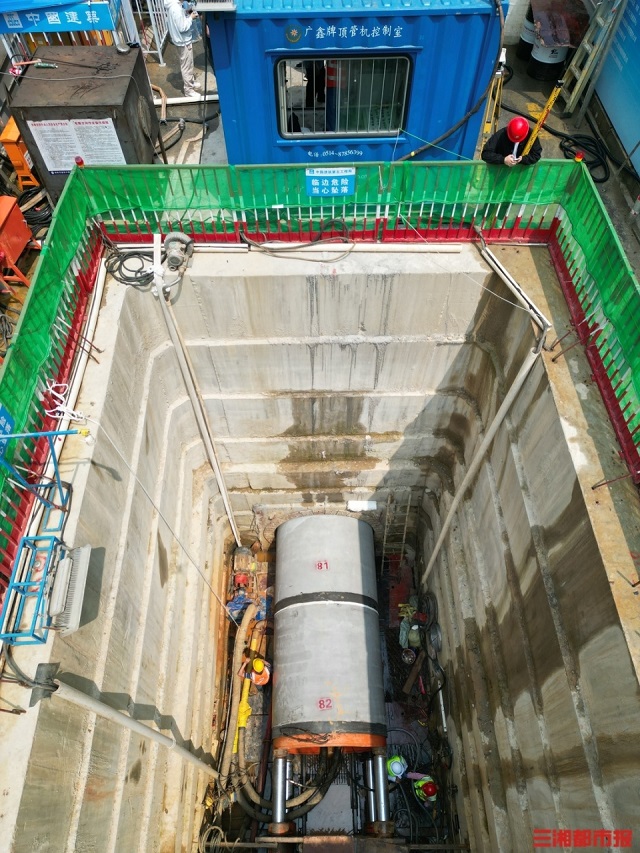 由長(zhǎng)沙市芙蓉區(qū)朝陽(yáng)路的一處圍擋而入,映入眼簾的是一處深基坑工作井。井深10米,井底有一條直徑2米、長(zhǎng)267米的管道正在施工。三湘都市報(bào)記者隨后系上安全帶,佩戴防墜器,沿著梯子向下來到管道口。路面之上,車水馬龍,10米之下,只能隱約能聽到管道內(nèi)作業(yè)人員施工的聲音。