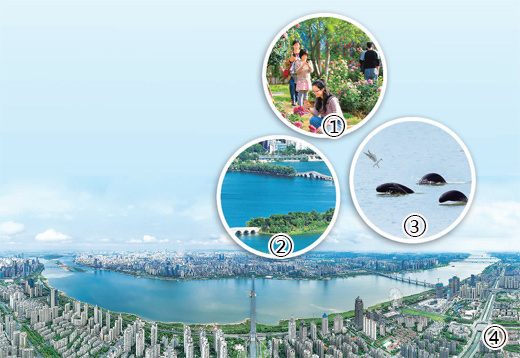 圖①:市民在濱江月季園游玩。馬悅 攝 圖②:象湖濕地公園。馬悅攝 圖③:在贛江水域嬉戲的江豚。余會功攝 圖④:穿南昌城而過的贛江。