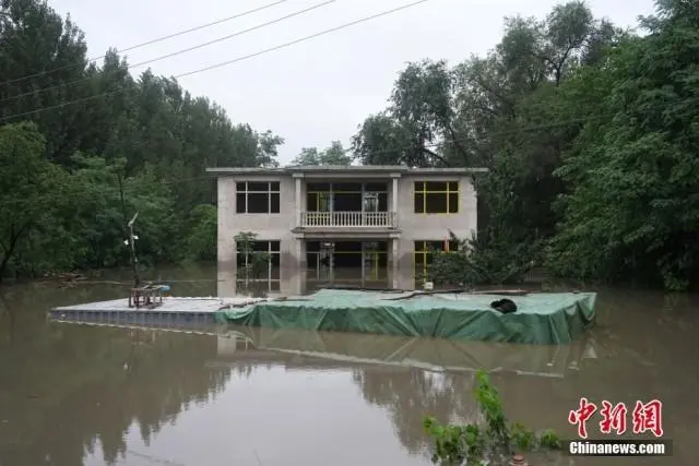 7月31日,北京市房山區(qū)竇店鎮(zhèn)蘆村,臨近大石河的一座尚未完工的房屋被淹。