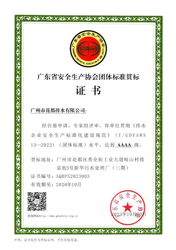 廣州水投花都排水公司獲得排水企業(yè)安全生產(chǎn)標(biāo)準(zhǔn)化AAAA級(jí)證書