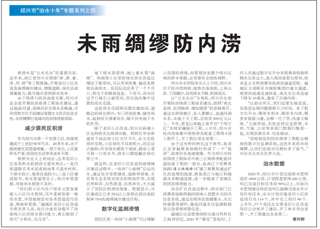排澇水是“五水共治”的重要內容。近年來,浙江省紹興市圍繞“滲、滯、蓄、凈、用、排”等工程措施,開展老舊小區(qū)改造及海綿城市建設,增強道路、綠化徑流調蓄能力,提升城市管網排水效率。