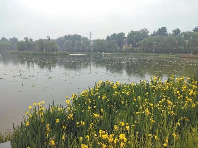 5月10日下午,北京迎來一場陣雨,記者前往龍潭西湖公園探訪。雨下得不小,但公園內的路面上卻沒有什么積水,這是因為步道鋪設的大量透水磚使得雨水可以快速下滲。走近湖邊,一大片盛放的黃色鳶尾花在雨中顯得越發嬌艷。