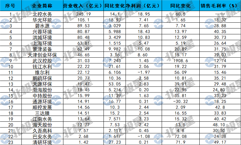 營業收入方面,北控水務營業收入最高,為245.19億元,首創環保、華光環能、碧水源、興蓉環境、洪城環境、中原環保、重慶水務、上海環境、景津裝備進入前十。