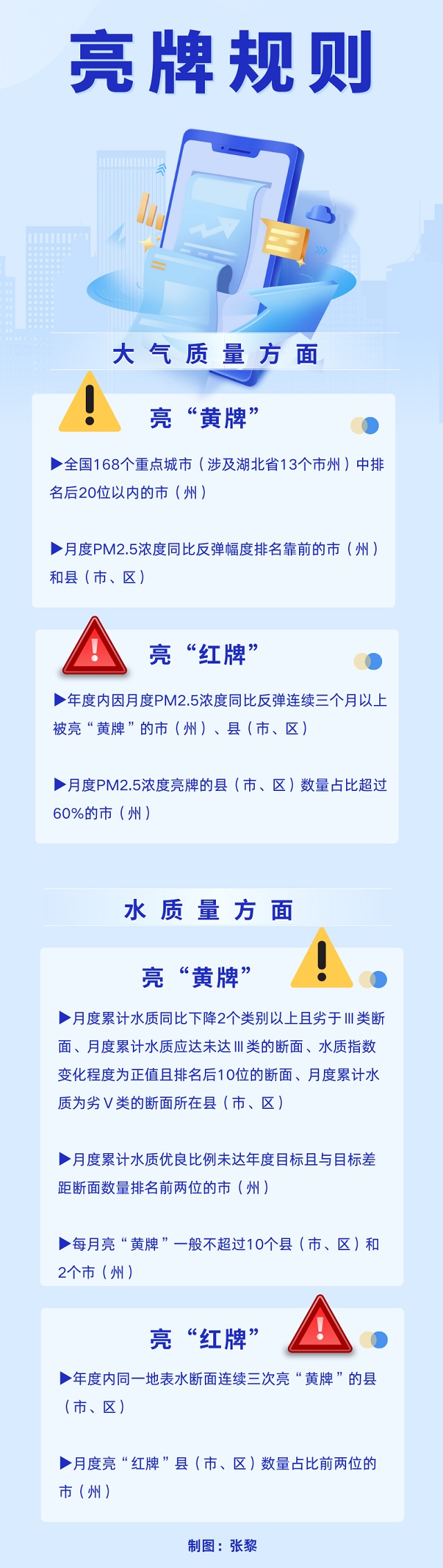 具體而言,大氣質量方面,對全國168個重點城市(涉及湖北省13個市州)中排名后20位以內的市(州)亮“黃牌”;年度內因月度PM2.5濃度同比反彈連續3個月以上被亮“黃牌”的市(州)、縣(市、區),將亮“紅牌”。