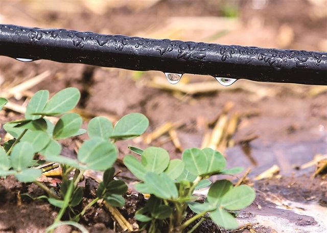 河南省博愛縣金城鄉武閣寨村,村民用滴灌為花生澆水。