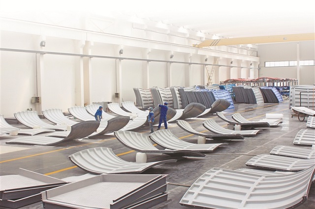 江蘇海鷗冷卻塔股份有限公司的車間內,工人正在對節水型冷卻塔風筒部件進行配對組裝。 江蘇海鷗冷卻塔股份有限公司供圖