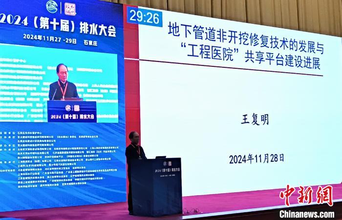 中國工程院院士、中山大學教授王復明做了題為《地下管道非開挖修復技術的發展與“工程醫院”共享平臺建設進展》的報告。他系統分析了當前城市地下管網、隧道等基礎設施面臨的水災害及病害難題,深入講述了團隊在地下工程滲漏防治、地下管道非開挖修復等方面取得的成果。他介紹說,當前“工程醫院”已覆蓋水利、土木、交通等絕大多數工程建設領域的基礎設施,為城市排水工程遇到的問題提供了解決方案。
