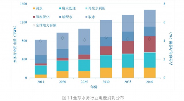 而污水處理不僅是水質凈化的過程,也是實現碳中和的重要組成部分。從能耗強度來看,城鎮水務一直被冠以能源密集型、高耗能行業。根據國際能源機構/IEA數據,水務行業耗電量(包括了遠距離調水和海水淡化)占到全球總耗電量的4%至6%,取水、污水處理和輸配水是耗電量最高的3個環節。