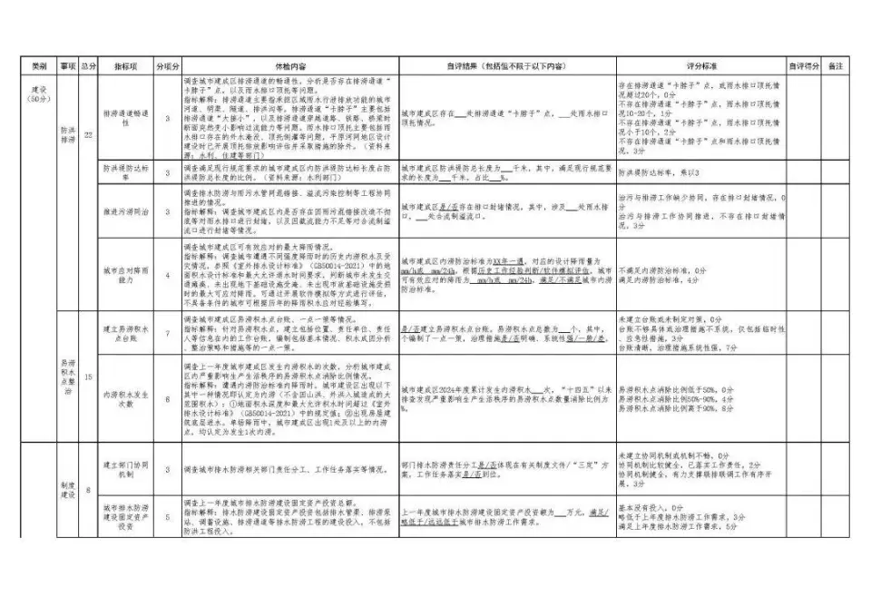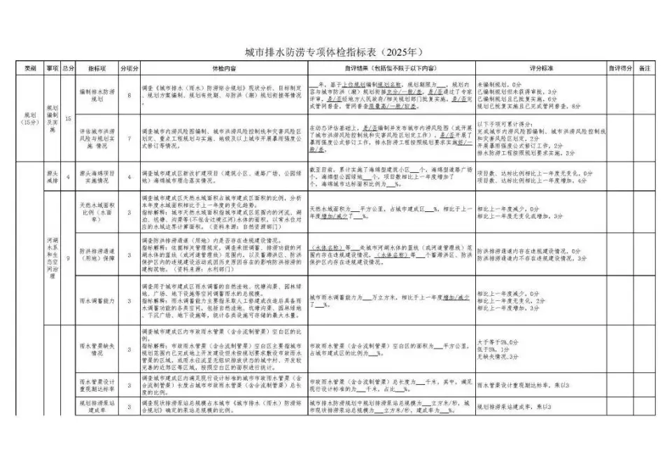 為深入貫徹落實(shí)黨中央、國(guó)務(wù)院決策部署,建立城市內(nèi)澇治理評(píng)估機(jī)制,我們?cè)?024年組織開(kāi)展城市排水防澇專項(xiàng)體檢自評(píng)估的基礎(chǔ)上,研究更新了《城市排水防澇專項(xiàng)體檢指標(biāo)表(2025年)》(見(jiàn)附件,以下簡(jiǎn)稱“指標(biāo)表”),現(xiàn)印發(fā)給你們。請(qǐng)你們結(jié)合2025年汛前準(zhǔn)備、隱患排查等工作,組織開(kāi)展城市排水防澇專項(xiàng)體檢自評(píng)估,全面排查城市防洪排澇體系的問(wèn)題短板和薄弱環(huán)節(jié)。專項(xiàng)體檢要覆蓋全部城市(包括地級(jí)及以上城市、縣級(jí)市,不含下轄縣、鄉(xiāng)、鎮(zhèn))。針對(duì)體檢發(fā)現(xiàn)的問(wèn)題,屬于本部門的,要明確措施和整改時(shí)限,持續(xù)推進(jìn)解決;需要相關(guān)部門解決的,城市建設(shè)(排水)部門要報(bào)告屬地政府,及時(shí)反饋和移交。