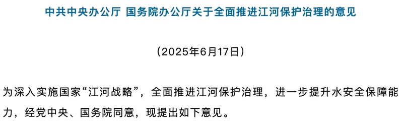 首次明確將流域綜合治理 提升至國家戰(zhàn)略高度 2025年6月17日,《中共中央辦公廳國務(wù)院辦公廳關(guān)于全面推進(jìn)江河保護(hù)治理的意見》(以下簡(jiǎn)稱《意見》)正式發(fā)布。