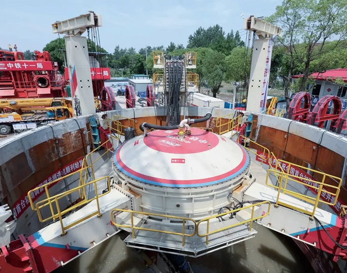 2025年6月18日,由中鐵十一局承建的上海虹莘排水泵站初雨調蓄管廊工程取得重要進展,投用于該工程的國產超大直徑豎井掘進機平穩始發。圖為初雨調蓄管廊工程施工現場