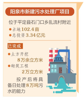該項目位于平定縣石門口鄉亂流村附近,占地102.4畝,總投資3.34億元,于去年5月正式開工建設。項目由陽泉市城市管理局負責實施,山西澤陽污水凈化有限公司承擔建設及建成后的運行維護工作。