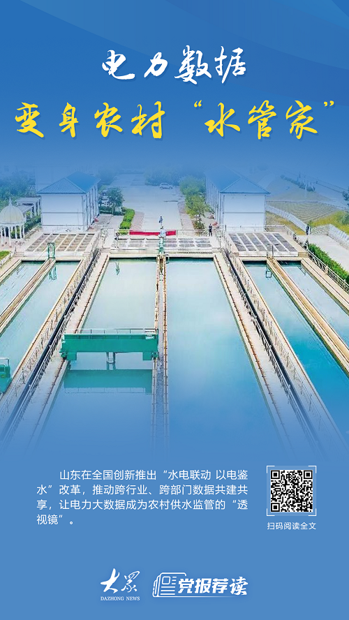 破題 電力大數(shù)據(jù)成監(jiān)管“透視鏡” 面對困局,山東以跨界融合思路破題,在全國創(chuàng)新推出“水電聯(lián)動以電鑒水”改革,推動跨行業(yè)、跨部門數(shù)據(jù)共建共享,讓電力大數(shù)據(jù)成為農(nóng)村供水監(jiān)管的“透視鏡”。趙琳介紹,省水利廳與國家電網(wǎng)山東省電力公司近日聯(lián)合印發(fā)的《關于開展“水電協(xié)同以電鑒水”專項行動賦能農(nóng)村供水保障與鄉(xiāng)村治理現(xiàn)代化的通知》,標志著這一改革正式落地。