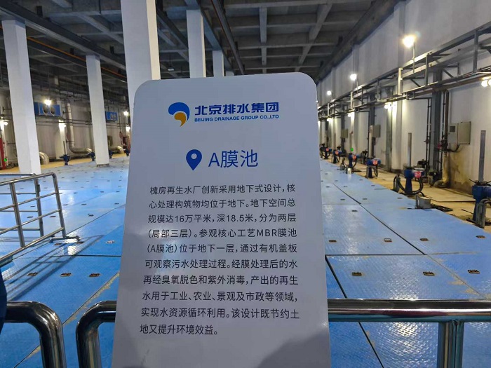 從生物池出來后,污水便進入了膜池。槐房再生水廠應用了北排集團自主研發的“膜科技”,采用了先進的膜生物反應器(MBR)污水處理工藝,隱藏于污水下的MBR工藝超濾膜產品,可以高效去除污水中99%的懸浮固體以及絕大部分細菌、微生物。